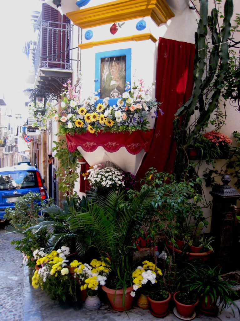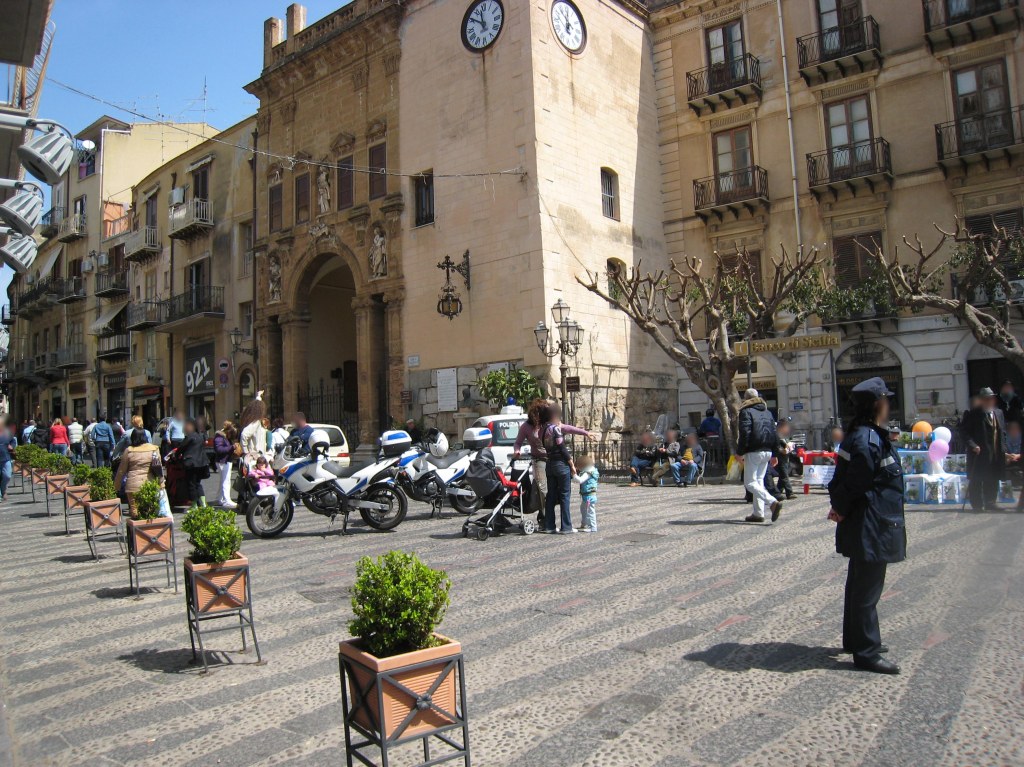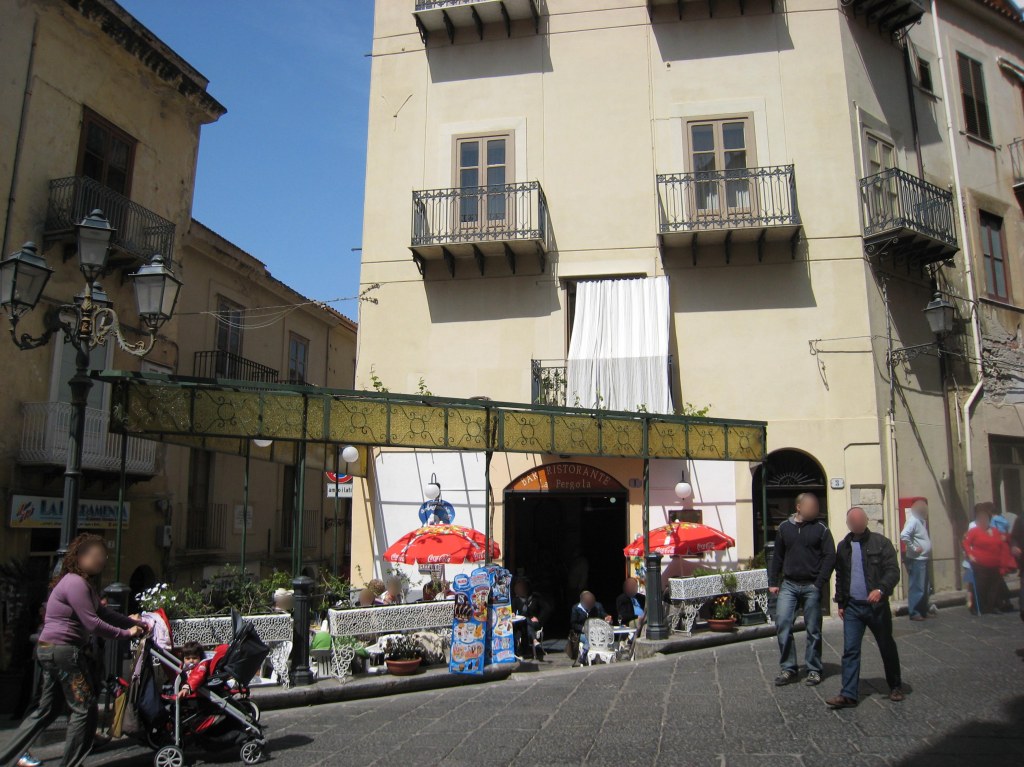 De centrale plaats in het verhaal is Cefalù. ( http://www.cefalu-sicily.it/english/index.htm ). Toen ik al een belangrijk deel van het verhaal geschreven had, waren wij in Cefalù. Na een ochtendwandeling gingen wij iets drinken op het terras van La Pergola, een bar-restaurant op de Piazza Garibaldi. Dit plein ligt aan het begin van de oude stad, waar de Corso Ruggero leidt naar het centrum met de Kathedraal, en de Via Salvatore Spinuzza naar de Lungomare, de boulevard langs de zee.